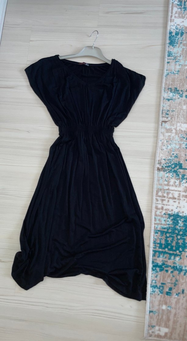 Siyah renk, V yakalı, kolsuz uzun elbise. Salaş kesim ve drapeli tasarımıyla günlük kullanıma uygun, minimal bohem tarzda bir modeldir.