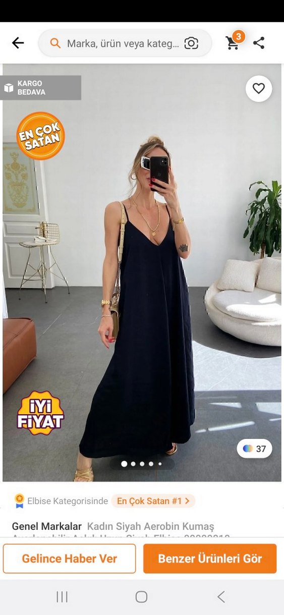 Siyah uzun elbise, salaş kesim, askılı ve V yakalıdır. İpek gibi dokusuyla günlük kullanıma uygun, zahmetsiz şıklık sunar. etiket uzerınde bn minyon olduğum için yakışmadı bol geldı salas bı elbise. 40.42 rahat kullanır
