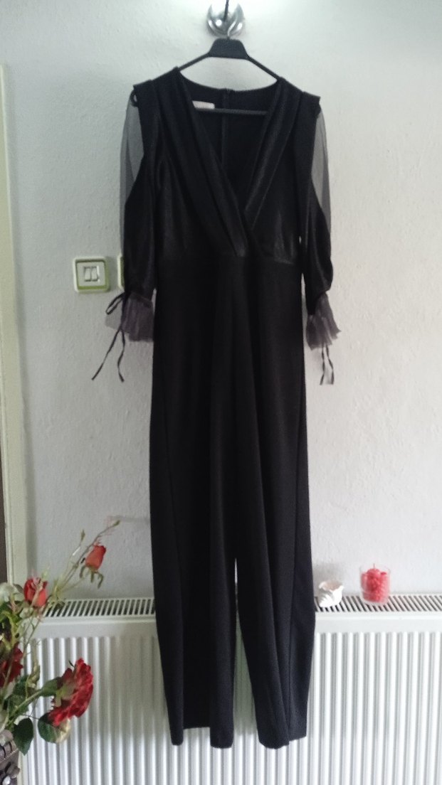 Siyah renkli, sentetik kumaştan yapılmış uzun ve salaş tulum. V yakalı, askılı kollu ve drapeli detaylara sahip, ofis için uygun gotik tarzda.boy 1.50 göğüs 42 cm bel 40 cm likralı kumaş M ⭐ L BEDEN UYUMLUDUR marka temsili