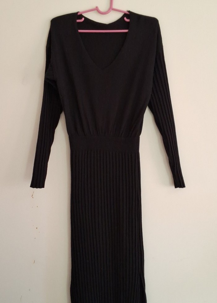 V yaka ve uzun kollu, siyah triko kumaştan yapılmış, vücuda oturan minimalist tarzda günlük kullanıma uygun elbise. deposu söküğü yoktur. yanları dize kadar yırtmaçlı çok şık