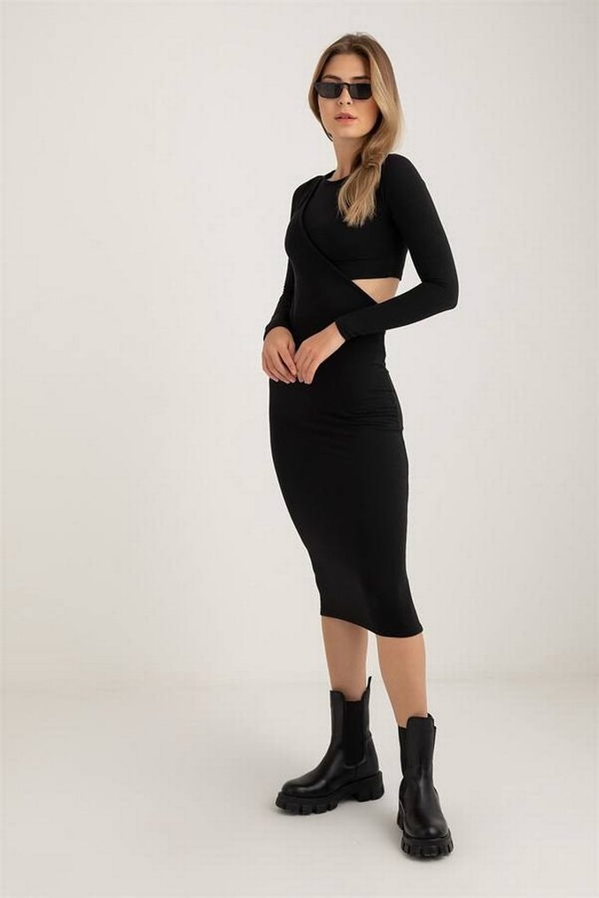 V yakalı, uzun boy siyah triko elbise, yumuşak sentetik kumaştan üretilmiştir. İnce ve şık kesimiyle, askılı kolları günlük kullanıma uygundur.