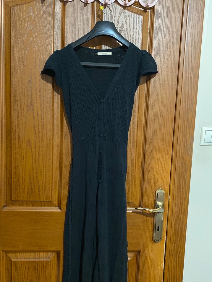 Siyah triko kumaştan, V yakalı ve kısa kollu, düğmeli uzun ve vücuda oturan bir elbisedir. Minimalist ve gotik tarzda, günlük kullanım için uygundur.