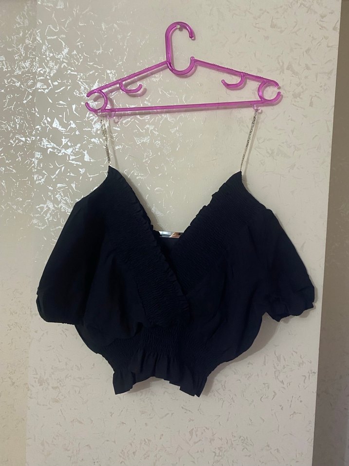 Siyah renkli, V yakalı ve askılı kısa bustiyer. Volan detayları ve bol kesimiyle gotik tarzda, sentetik kumaştan üretilmiştir.