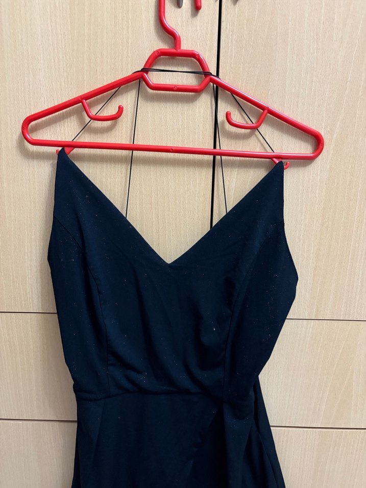 Siyah renkli, V yakalı ve ince askılı bu abiye elbise, drapeli ve vücuda oturan kesimiyle romantik akşamlar için uygun, minimal ve cesur bir tarza sahip.