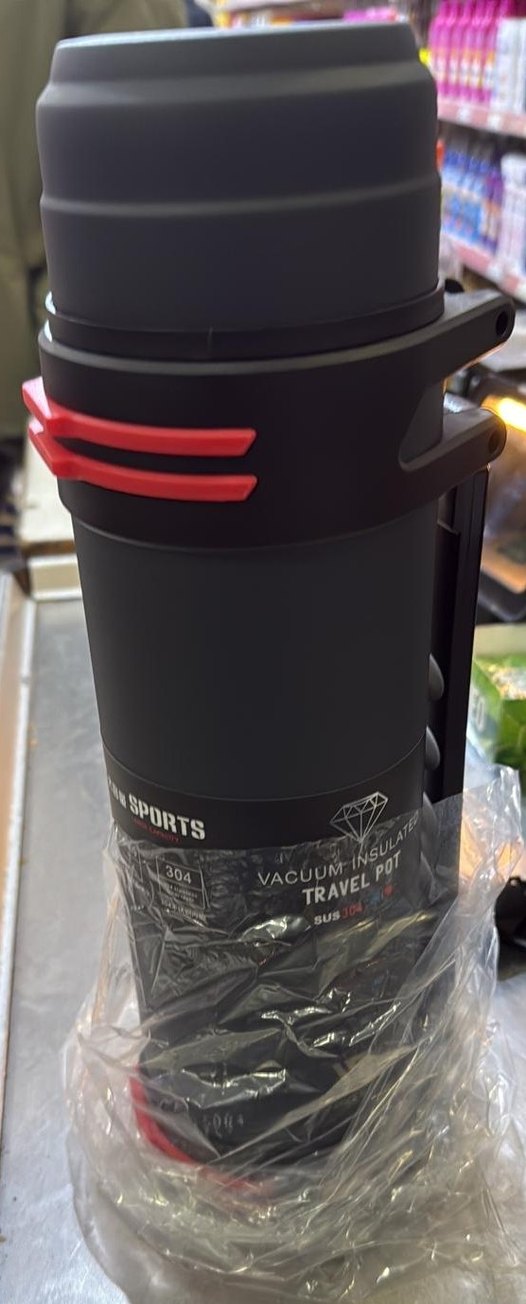 Kırmızı detaylı kapaklı siyah vakum izolasyonlu seyahat termosu, içecekleri sıcak tutmak için uygundur.