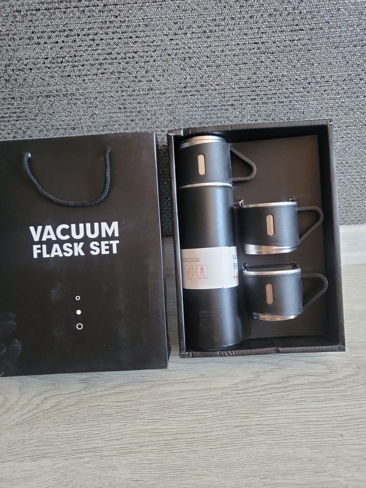 Diger markasına ait siyah vakumlu termos seti, bir adet termos ve iki adet kulplu bardaktan oluşur. İçeceklerinizi sıcak veya soğuk tutar. ☕