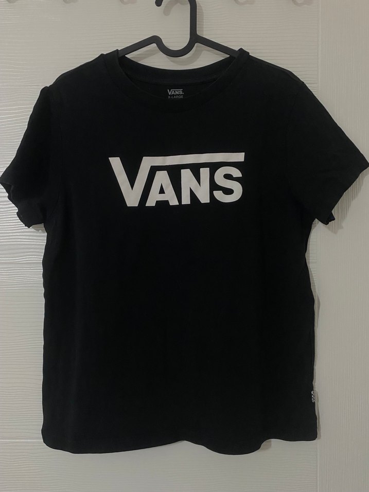 Siyah renkli Vans tişört, kısa kolludur. Pamuklu kumaştan üretilmiş, baskılı logo ile rahat bir sokak stili sunar. Renk solması biraz var fotoğrafta görünüyor. X large diyor ama dar kalıp bu yüzden s olur diye düşünüyorum. Unisex