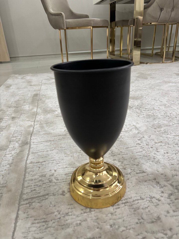 Siyah mat yüzeyli vazo, altın renkli tabanıyla şık bir görünüm sunar.