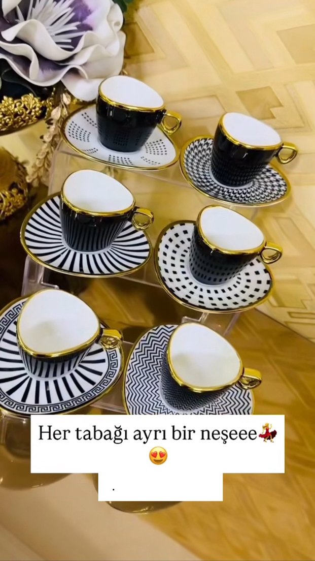 Altın kulplu siyah fincanlar ve her biri farklı desenli tabaklarla şık bir takım. Her tabağı ayrı bir güzellik sunuyor. ☕