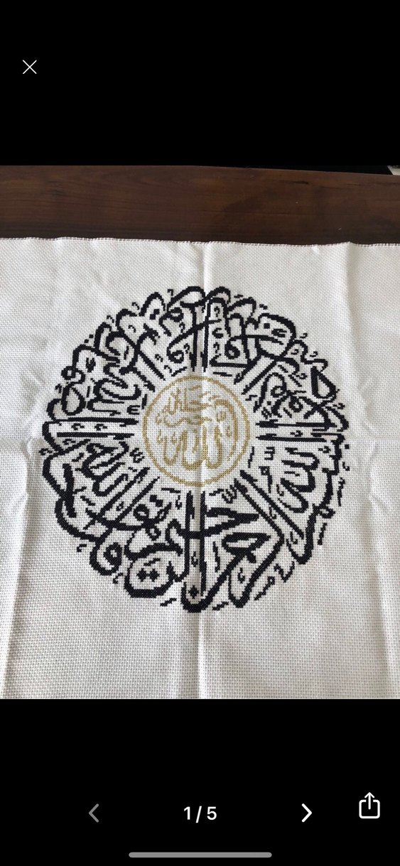 Bu tablo, beyaz zemin üzerinde siyah İslami hat sanatıyla dairesel bir desen ve ortasında altın renkli detay içerir. ️
