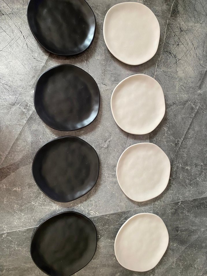 Gri ve beyaz renkte, hafif düzensiz tasarımlı seramik tabak seti. Modern sunumlar için uygundur. 4 adet siyah, 4 adet beyaz.