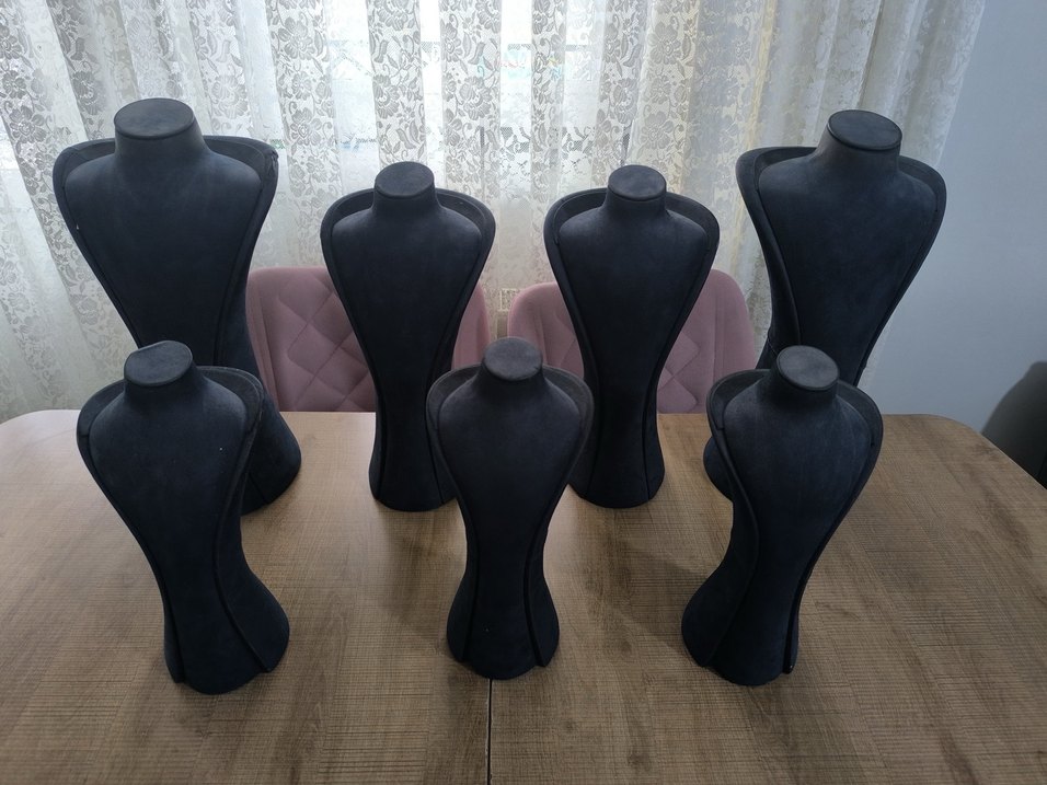 Siyah, şık tasarımlı takı mankenleri seti, kolye ve aksesuar sergilemek için uygundur.