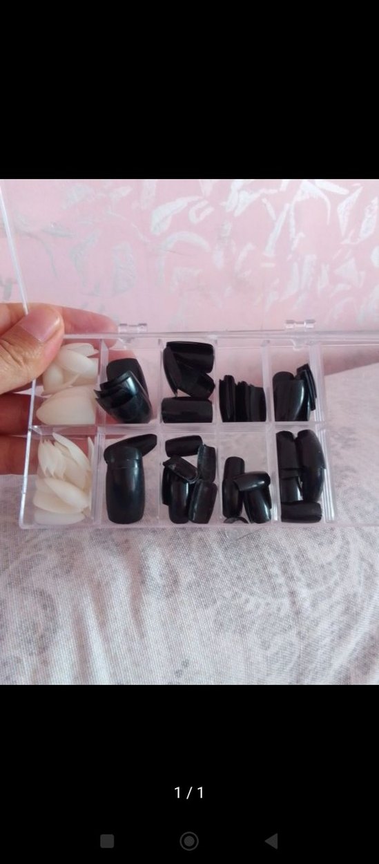 Çeşitli boylarda siyah ve beyaz takma tırnaklar, şeffaf bölmeli kutuda saklanmaktadır. Tırnak süslemeleri için uygundur. 73 siyah 41 beyaz