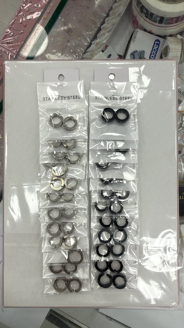 Siyah ve gri renkte, minimalist ve rock punk tarzda paslanmaz çelik erkek küpe setleri. Moda öncülerine uygun, şık ve sade aksesuarlar.