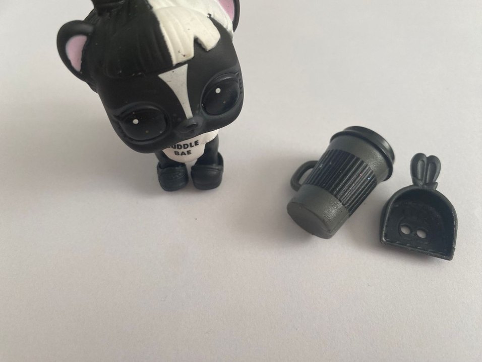 Büyük gözlere sahip küçük siyah ve gri lol bebek, çıkarılabilir gri aksesuar ile birlikte. Beyaz detaylı ve yazılı tişörtlü.