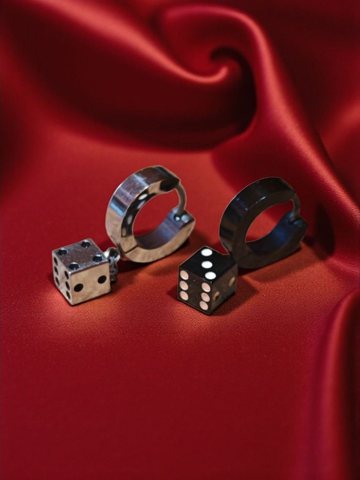 Siyah ve gümüş biker tarzı unisex küpe, zar figürlü detaylarla rock ve punk havasını avant-garde dokunuşla birleştirir.