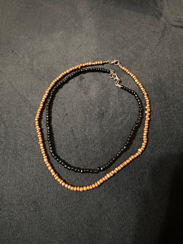 Bohem tarzda, siyah ve kahverengi boncuklardan oluşan minimal bir kolye. Normal midi uzunluğunda, günlük kullanıma uygun.