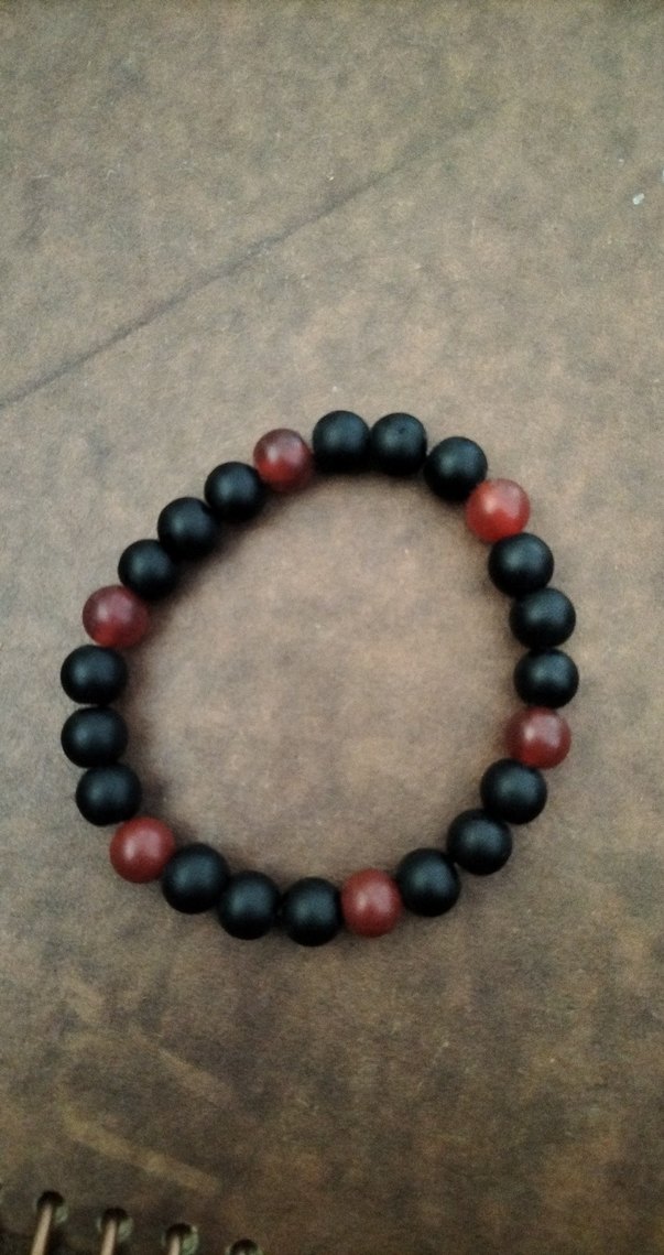 Kadın bilekliği, siyah ve kırmızı boncuklardan oluşur, bağlama desenlidir ve minimalist, gotik tarzlara uygundur. 1-2 kez kullanıldı.