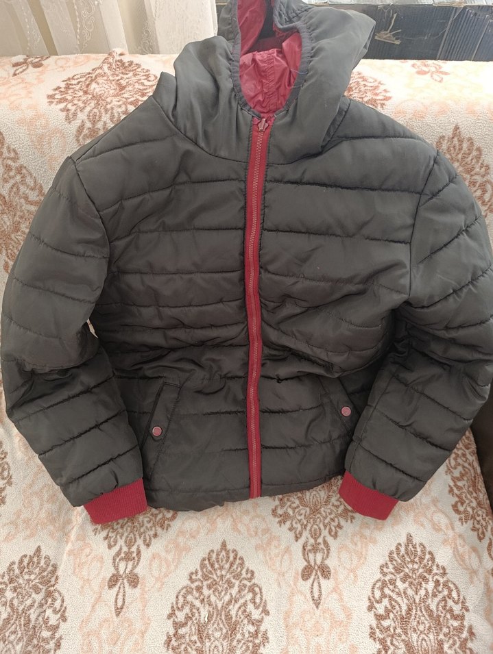 Fermuarlı, uzun kollu, yumuşak kumaştan siyah çocuk kışlık mont. çift taraflı kullanılabilir herhangi bir defosu yok sadece çok küçük belli olmayacak kadar leke var