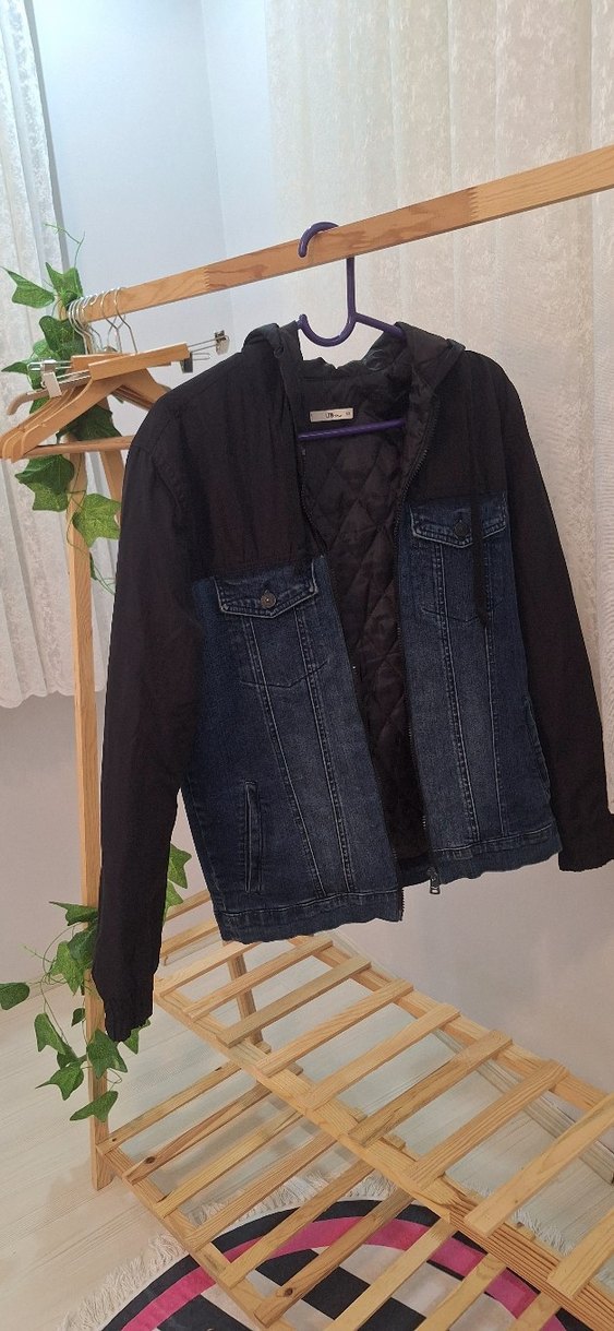 Erkek kot ceket, bol kesim ve düğmeli kapama ile siyah ve koyu mavi denim kombinasyonuna sahip. Notlu yaka ve uzun kolludur, günlük kullanıma uygundur. bir iki kere giyildi,tertemiz,hicbir defosu yoktur,cok kalitelidir