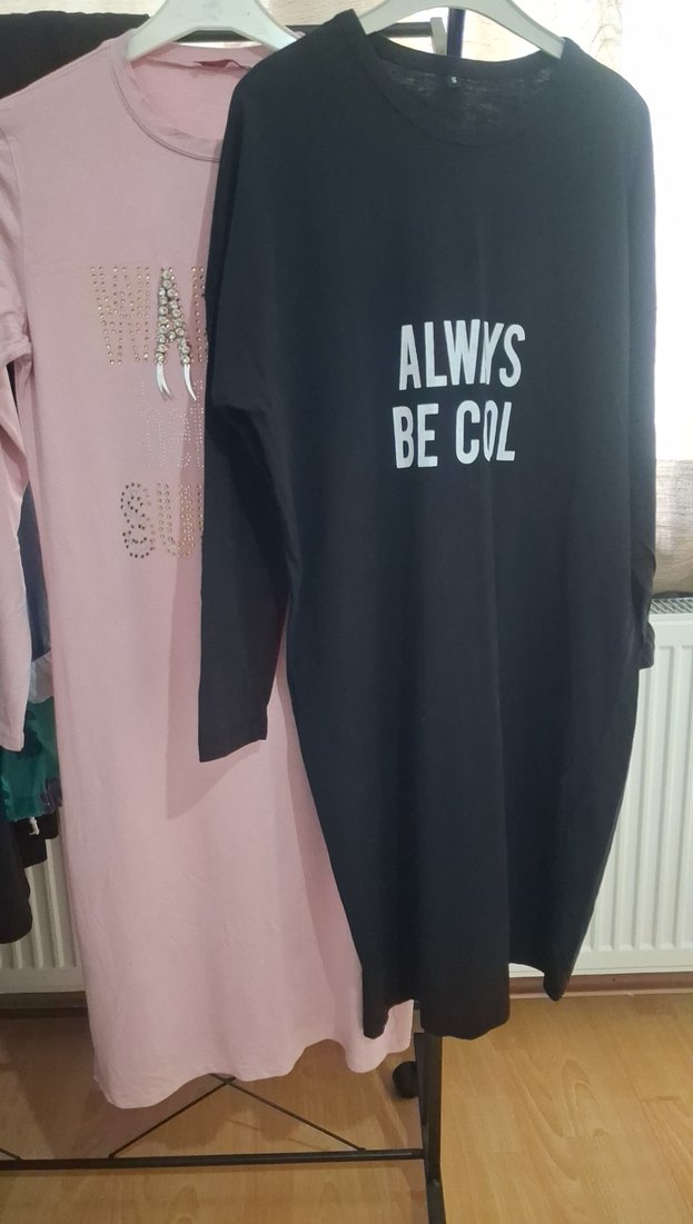 Pamuk kumaştan, uzun kollu, yuvarlak yaka ve baskılı siyah ve pembe tunik Rahat kesimi ve sokak stiline uygun tasarımıyla öne çıkar. günlük kullanıma uygun ikisinin fiyatıdır