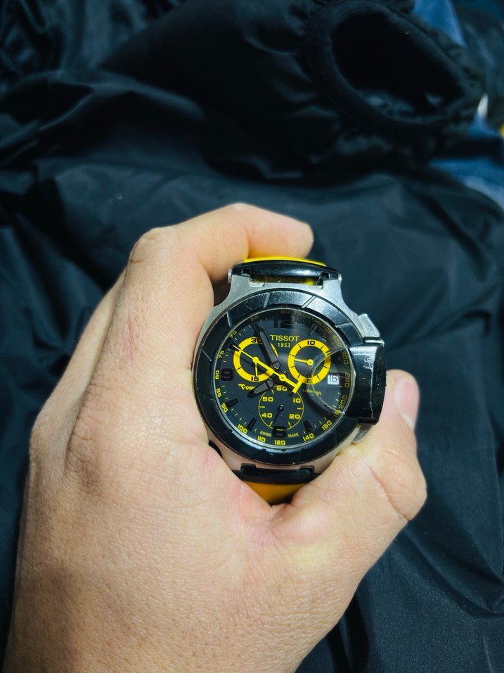 Siyah ve sarı renkli Tissot erkek kol saati, biker tarzında ve renkli kadranlıdır. Dayanıklı kayışa sahiptir, athleisure stiline uygundur. ⌚