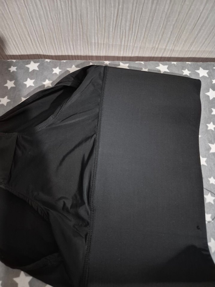 Siyah, sentetik kumaştan yapılmış, Velcro kapamalı, düz ve desensiz midi boy hamile eteği. Spor ve athleisure tarzına uygundur.