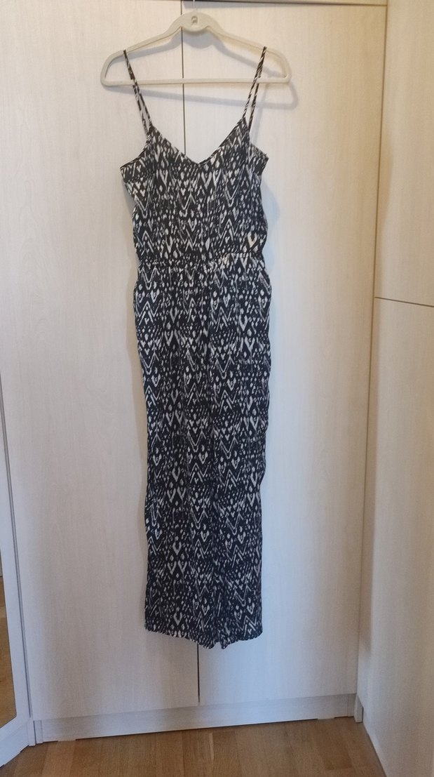 Gri bohem tarzda, V yakalı, askılı ve bol kesim uzun tulum. Yumuşak sentetik kumaştan, dış mekan kullanımı için uygun.