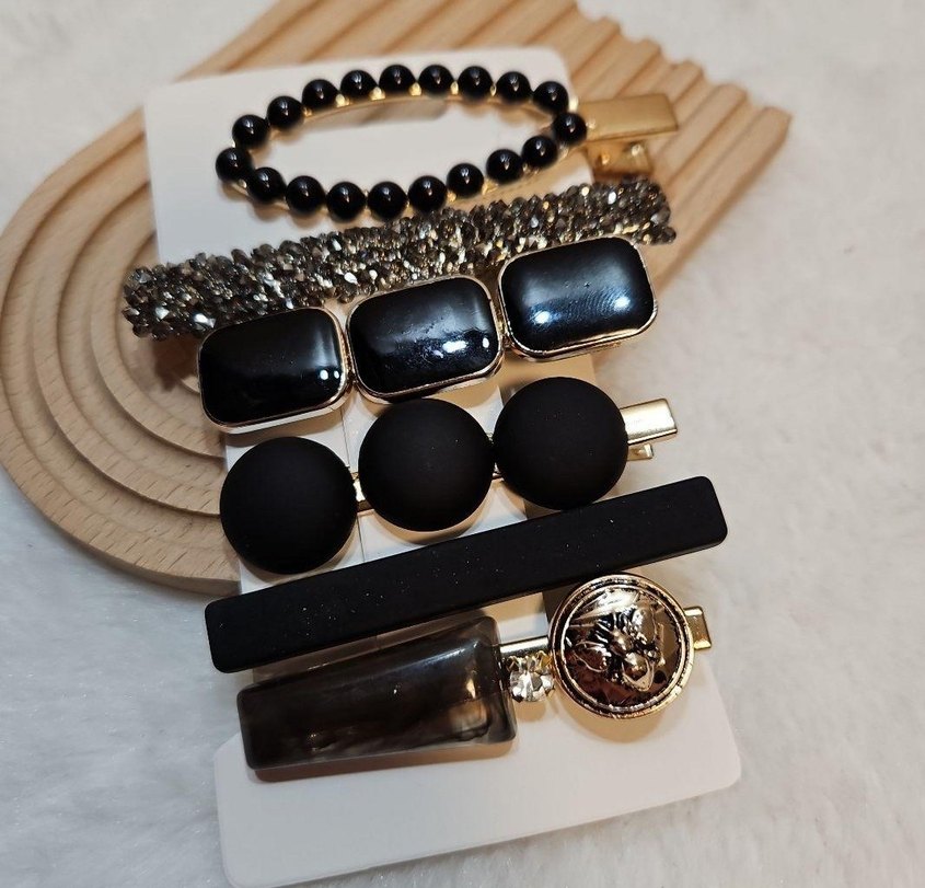 Siyah boncuklu ve ipeksi dokulu vintage gotik tarzda kadın saç tokası seti. Farklı şekil ve tasarımlarla çeşitlilik sunar.