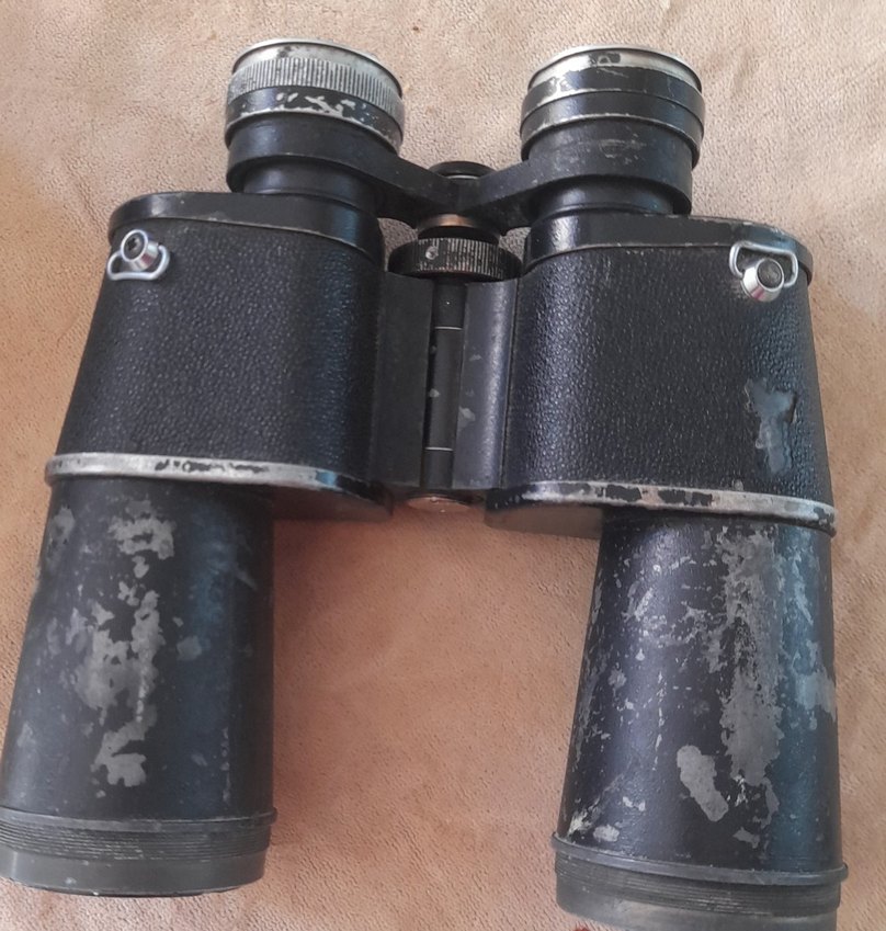 Siyah renkli, aşınmış metal gövde ve dokulu tutamağa sahip vintage dürbün. Ayarlanabilir gözlükleri ve net görüş için merkezi odaklama tekerleği bulunur.