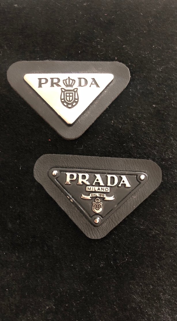 İki adet üçgen şekilli, siyah vintage tarzda erkek biker rozeti, metal detaylı ve üzerinde 'PRADA' ile 'MILANO' yazılıdır. ️