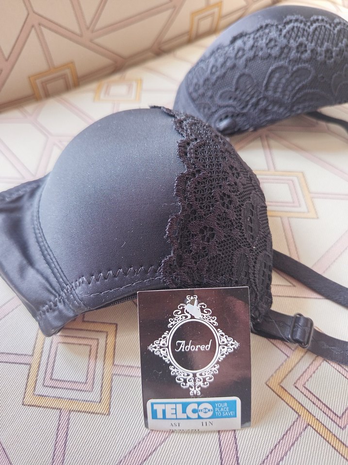 Siyah vintage gotik dantel detaylı ve baskılı desenli sütyen. Normal uzunlukta, Adored markalı. 34D beden