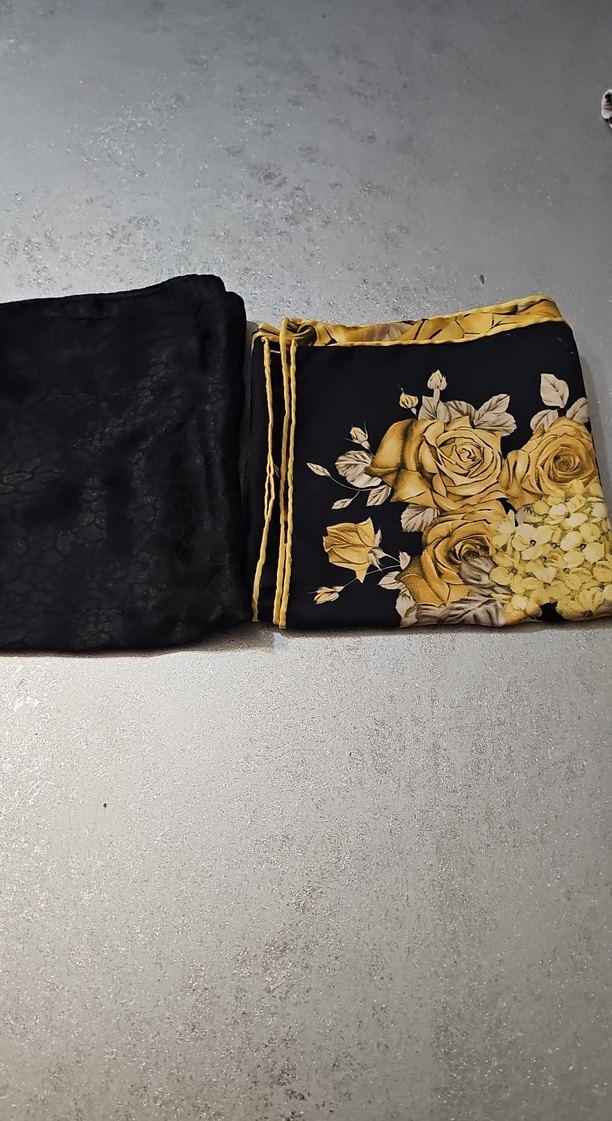 Kadınlar için ipeksi dokulu, siyah zemin üzerine altın sarısı vintage çiçek desenleri taşıyan şal. Bohem ve retro tarzlara uygun, drapeli model.