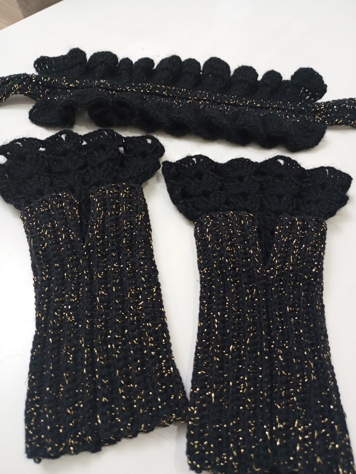 Siyah örgü kadın eldivenleri ve boyunluk, vintage tarzda ve özel desenlerle tasarlanmıştır. Moda ve avangart görünüm için idealdir.