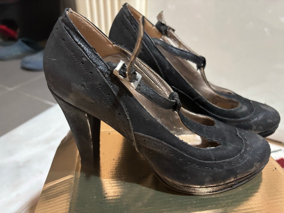Lastik malzemeden yapılmış, tokalı siyah vintage platform topuklu ayakkabılar. Gotik tarzıyla romantik akşamlar için uygun.