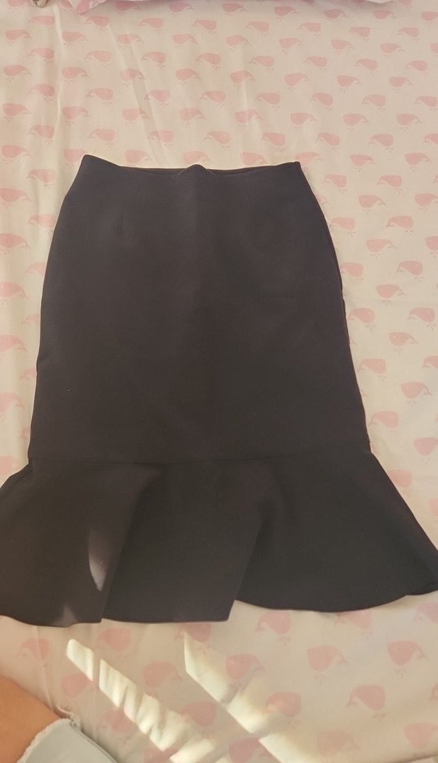 Siyah, volanlı midi sentetik kumaştan, ofis kullanımı için uygun, cesur goth tarzını yansıtıyor.
