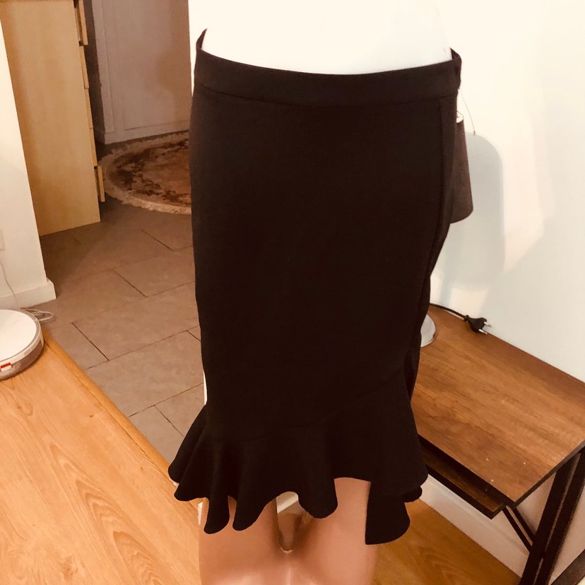 Siyah, vücuda oturan hamile midi eteği, volan detaylıdır ve sentetik kumaştan üretilmiştir. Ofis kullanımı için uygundur, gotik tarzda.