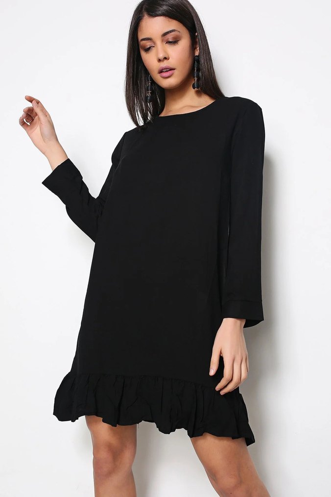 Siyah midi elbise, uzun kollu ve yuvarlak yakalıdır. Volanlı etek ucu ve bol kesimiyle romantik akşamlar için uygundur.