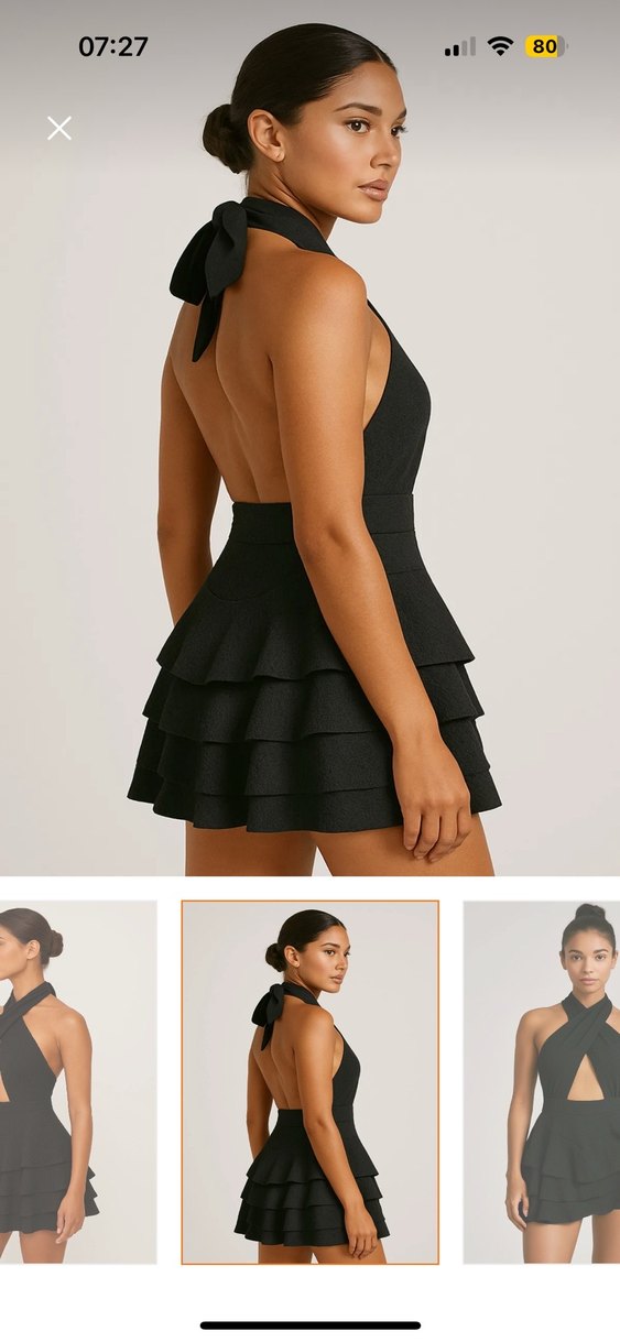 Siyah mini elbise, V yakalı ve askılı, kat kat volanlı ve sırtı bağlamalı, pürüzsüz sentetik kumaştan, parti için uygun.zara değil