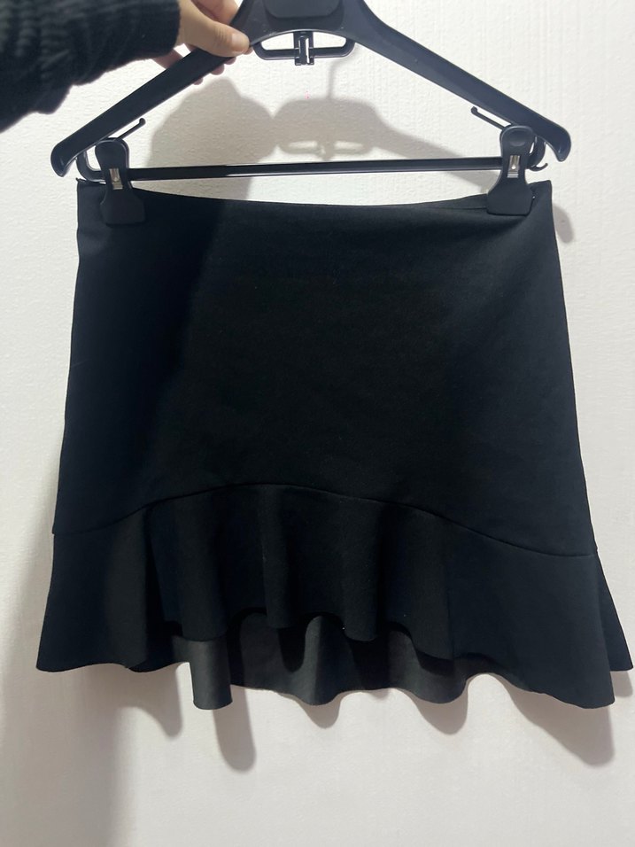 Sentetik kumaştan üretilmiş, volanlı ve siyah renkte, vücuda oturan mini etek. Minimalist gotik tarz için uygundur.