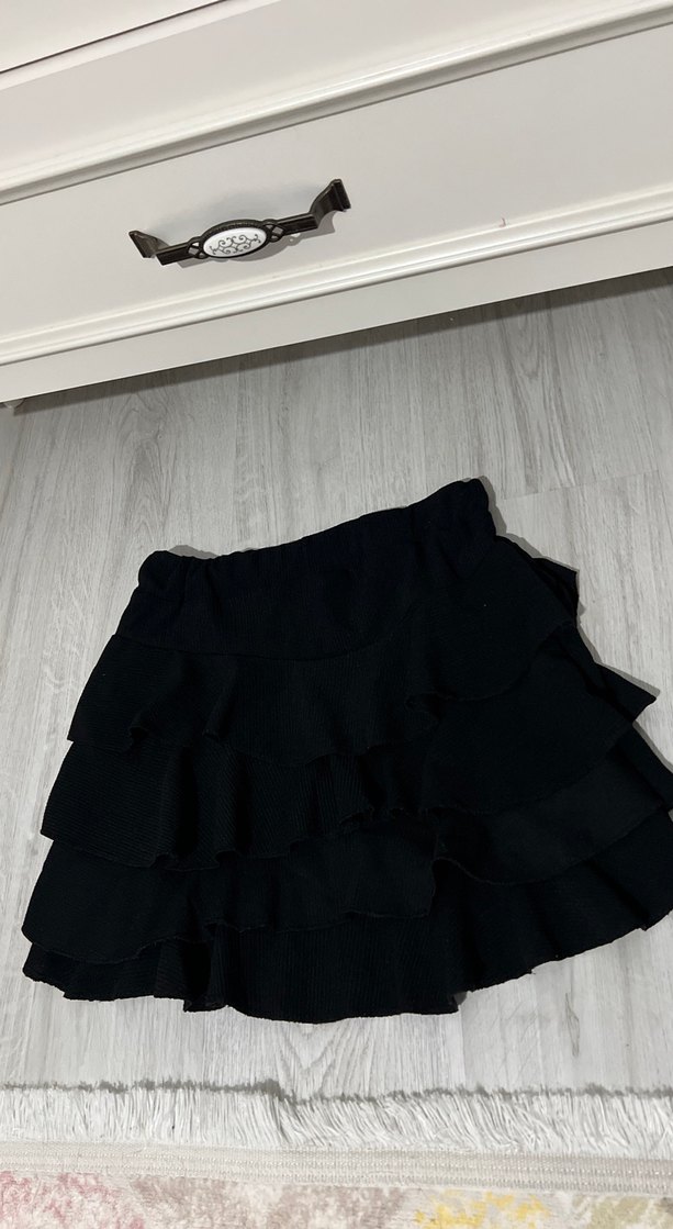 Siyah renkte, sentetik kumaştan yapılmış, bol kesim ve katmanlı volan detaylı mini etek. Günlük kullanıma uygun sade gotik tarzda.