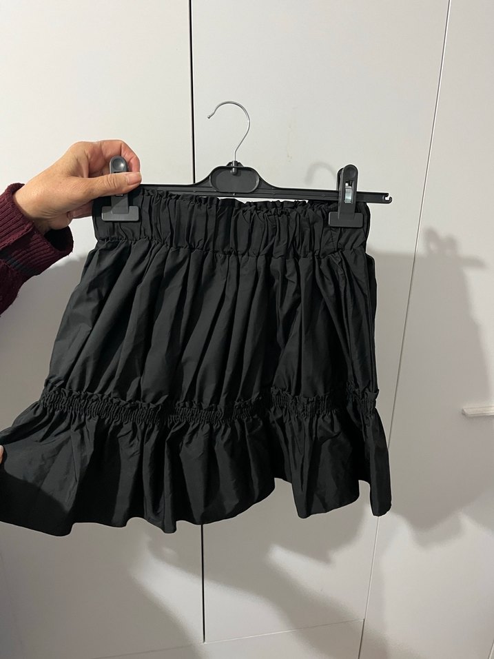 Siyah renkli, yumuşak sentetik kumaştan, bol kesim ve volan detaylı mini etek. Günlük sokak modasına uygun, Paris tarzı etkisiyle.