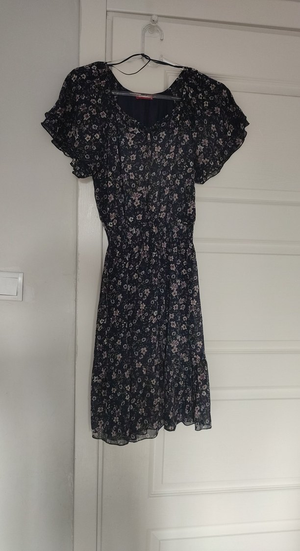 Volan detaylı, kısa kollu ve V yakalı salaş midi elbise. Koyu renkli batik desenli, romantik akşamlar için uygun, yumuşak sentetik kumaştan yapılmıştır.