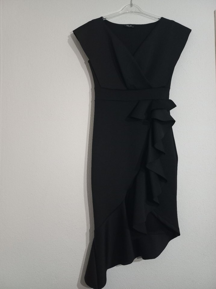 Siyah, v yaka ve volan detaylı, fitted kesim uzun elbise.