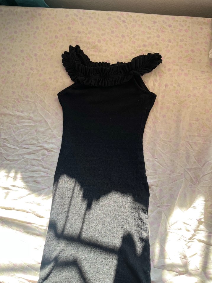 Siyah, volanlı yüksek yakalı ve kolsuz tasarıma sahip, vücuda oturan mini triko elbise, gotik tarzda şık bir görünüm sunar.
