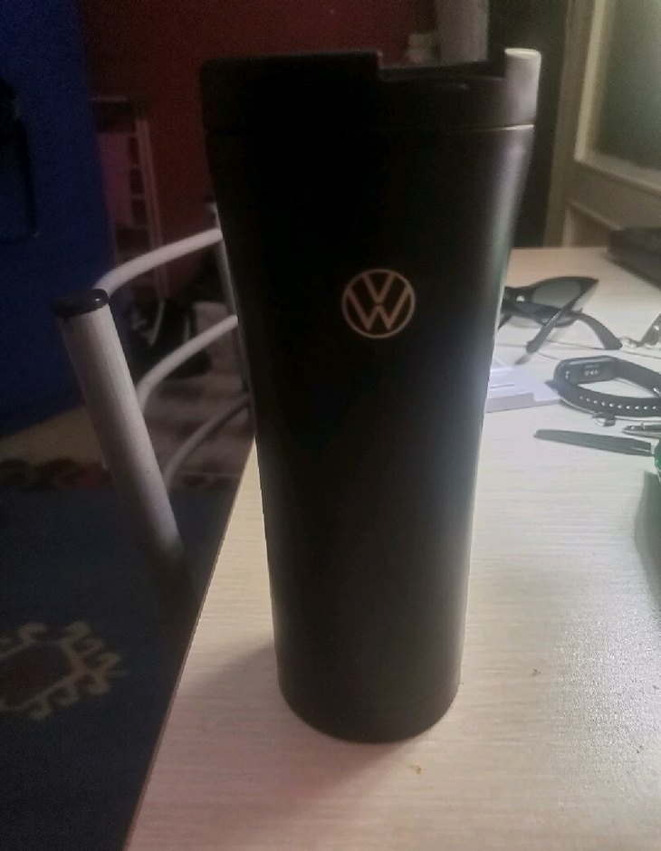 Logosu bulunan, modern ve şık görünümlü siyah termos mug.