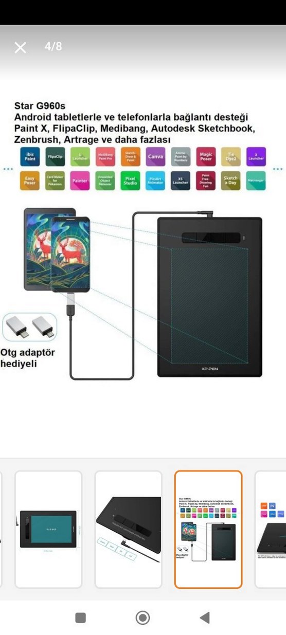 Android telefon ve tabletlerle uyumlu siyah XP-Pen tablet, OTG adaptör hediyeli, Zenbrush, Artrage, Paint X, FlipaClip, Medibang ve Autodesk Sketchbook destekli.