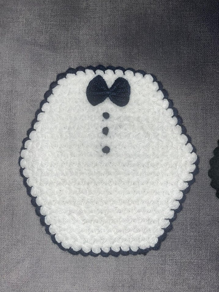 siyah ya da lacivert renkte, nakış detaylı ve papyon desenli bebek önlüğü, yumuşak kumaştan üretilmiştir.