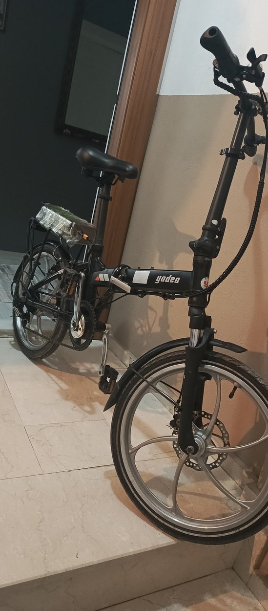 Siyah Yadea katlanır bisiklet, sağlam gövde ve rahat seleye sahiptir. Ön ve arka frenlerle donatılmıştır. bataryası tek dolumda 30 ile 40 kilometre rahatlıkla yol gitmekte denedim hızı 25 ile 30 kilometre değişiyor tabii arttırılabilir katlanabilen fotoğraflarda görüldüğü gibi Kozmetik olarak da durumu çok iyi herhangi bir arızası yoktur Her şeyi çalışır durumda diğer elektrikli bisikletler gibi direksiyonda bir sürü düğme yoktur gösterge karışık sadece kaskolu takılı pedalı iptal ettirdik gaz kolundan gidiyor