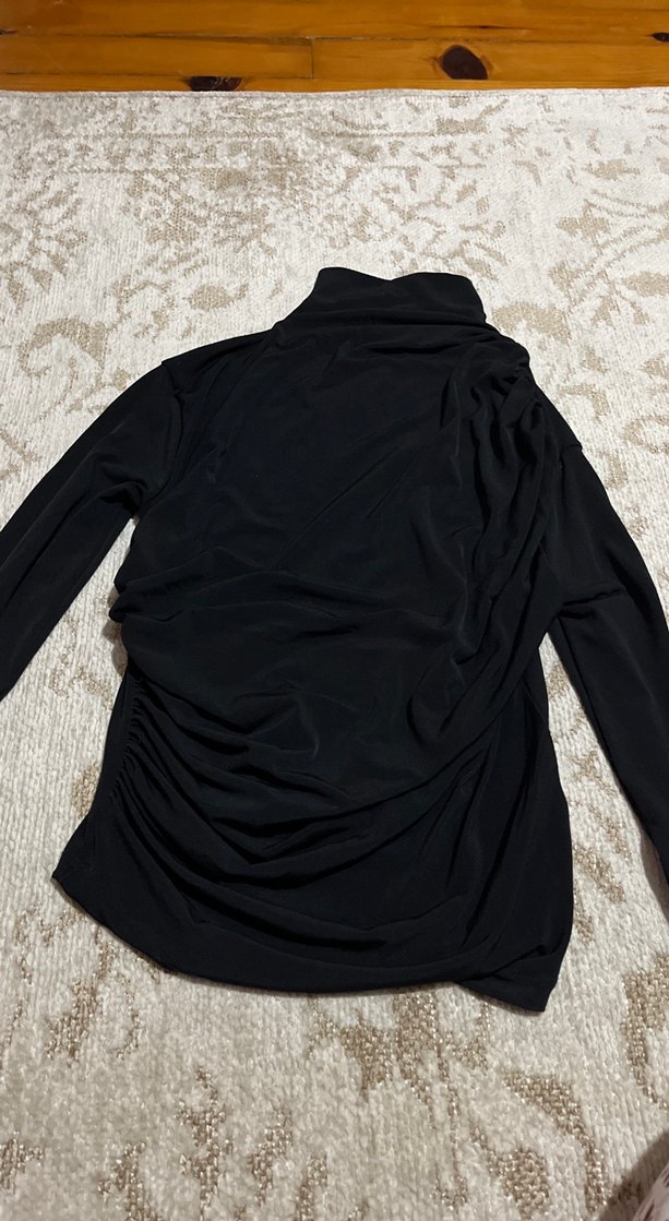 Siyah, balıkçı yaka ve uzun kollu, vücuda oturan drapeli kadın bluz. Yumuşak ve sıcak kumaştan, günlük kullanıma uygun goth ve athleisure tarzında.